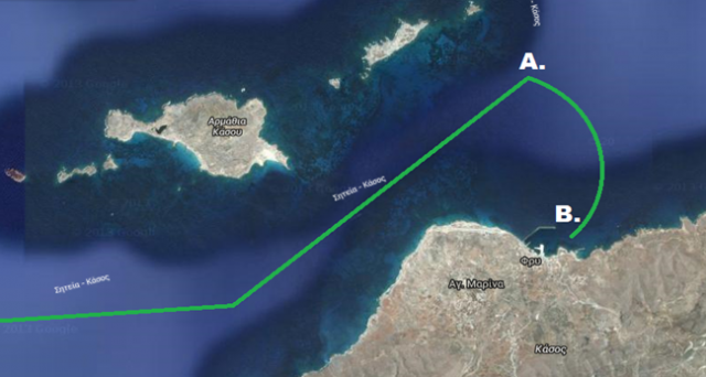 Εικόνα 1. Ο τρόπος προσέγγισης του "Β. Κορνάρος" στο λιμάνι της Κάσου.Στα 2 μίλια από το λιμάνι (σημείο Α.), κάτω από το νησί της Καροφίλας συγκεκριμένα, άρχισε η αργή ανοιχτή δεξιά στροφή του, αρχίζοντας με αυτό τον τρόπο την διαδικασία προσέγγισης στο λιμάνι του νησιού και ανεβάζοντας την αδρεναλίνη στα ύψη για τους λόγους που προαναφέραμε. Φτάνοντας στην είσοδο του λιμανιού, το πλοίο ευθυγραμμίζεται στον άξονα Ανατολή-Δύση, με κατεύθυνση προς Δύση, και με δρόμο, πολύ όμως δρόμο, μπαίνει στο λιμάνι (σημείο Β.).