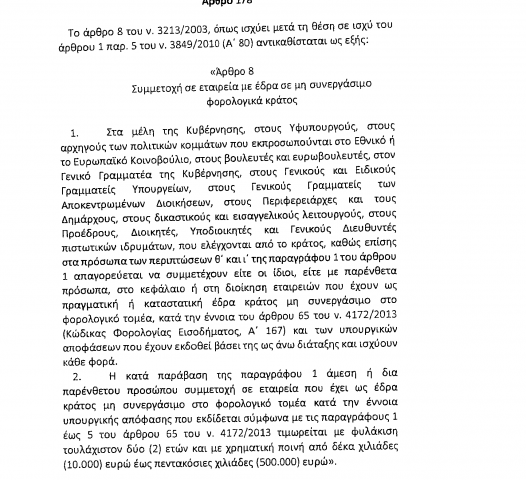 Η κεντρική κυβέρνηση αδιαφορεί για κάτι τέτοια. Ενδιαφέρεται, όμως, για άλλα πράγματα η αριστερή [τρόπος του λέγειν] σημερινή κυβέρνηση, η οποία θεώρησε ότι δεν είναι δυνατόν οι υπουργοί και οι βουλευτές να μη μπορούν να μετέχουν σε υπεράκτιες εταιρείες, εξ ου και όπως απεκάλυψε πρώτο το ΠΡΩΤΟ ΨΕΜΜΑ, οι 153 γενναίοι βουλευτές της συμπολίτευσης ψήφισαν την 22.05.2016 εν μέσω άφατης θλίψης,  θρήνων και στεναγμών και το άρθρο 178 που ορίζει τα εξής (φωτο1):