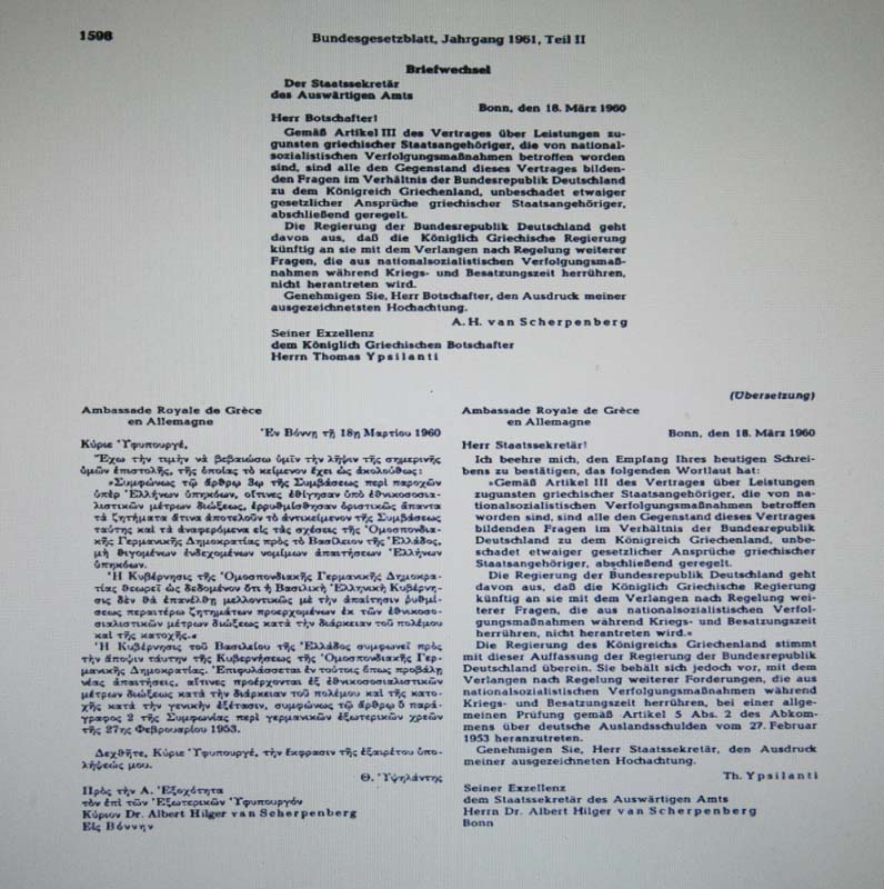 Η Κυβέρνησις της Ομοσποδιακής Γερμανικής Δημοκρατίας θεωρεί ως δεδομένον ότι η Βασιλική Ελληνική Κυβέρνησις δεν θα επανέλθη μελλοντικώς με την απαίτησιν ρυθμίσεως περαιτέρω ζητημάτων προερχομένων εκ των εθνικοσοσιαλιστικών μέτρων διώξεως κατά την διάρκειαν του πολέμου επί της κατοχής.