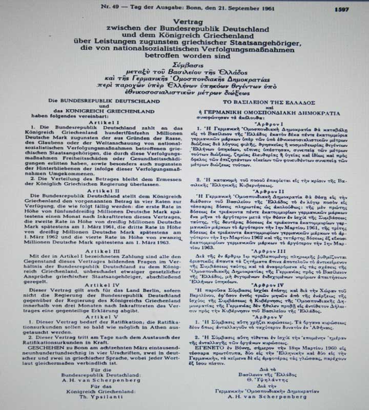 1. Η Γερμανική Ομοσπονδιακή Δημοκρατία της Γερμανίας θα καταβάλη εις το Βασίλειον της Ελλάδος εκατόν δέκα πέντε εκατομμύρια γερμανικών μάρκων υπέρ των υπό εθνικοσοσιαλιστικών μέτρων διώξεως δια λόγους φυλής, θρησκείας ή κοσμοθεωρίας θιγέντων Ελλήνων υπηκόων, οίτινες υπέστησαν, συνεπεία των μέτρων τούτων διώξεως ζημίας, ελευθερίας η υγείας και ιδίως και προς όφελος των επιζησάντων οικείων των φονευθέντων συνεπεία των μέτρων διώξεως τούτων.