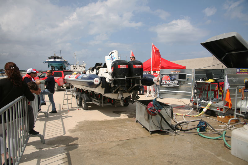 Η δυναμομέτρηση του κινητήρα του ολοκαίνουργιου Olympic.Περιστατικό Α΄ : Την Παρασκευή 1η Μαίου, τα φουσκωτά σκάφη τα οποία θα λάμβαναν μέρος στον αγώνα, έρχονταν το ένα μετά το άλλο στο χώρο του ζυγίσματος και της δυναμομέτρησης. Μερικά σκάφη βγήκαν από τη γλύστρα, μετά από το πέρας κάποιων δικιμών, και πήγαν κατ' ευθείαν στην ηλεκτρονική ζυγαριά. Ένα από αυτά ήταν το σκάφος με τον αριθμό συμμετοχής 1. Δεν περιορίζομαι τυχαία στο σκάφος αυτό, μια και το Sport Rib του κ. Χαλκιόπουλου ήταν "πιστό" σε όλες τις παραβάσεις και υπερβάσεις, τις οποίες πιστεύω ότι ούτε καλύπτει ούτε νομιμοποιεί ο ισχύων Κανονισμός. Εν πάσει περιπτώσει, για το σκάφος αυτό η ένδειξη της ηλεκτρονικής ζυγαριάς σταμάτησε στον αριθμό 1.744 (κιλά). Αμέσως πάντως μετά το ζύγισμα του σκάφους του, ο κ. Χαλκιόπουλος έβγαλε δύο κιβώτια (αγνώστου βάρους) μέσα από τη θυρίδα που βρίσκεται στο πλωριό τμήμα του deck, και τα παρέδωσε στους βοηθούς του...