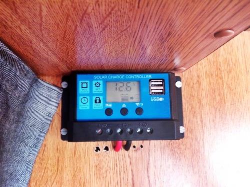 Ο ρυθμιστής τοποθετήθηκε από την πλευρά του διπλού κρεβατιού ψηλά και κάτω από τα ντουλάπια και με αυτό τον τρόπο μπορούμε να επιβλέψουμε την κατάσταση των Φ/Β μας αλλά και να χρησιμοποιήσουμε τις δύο θύρες usb του.
