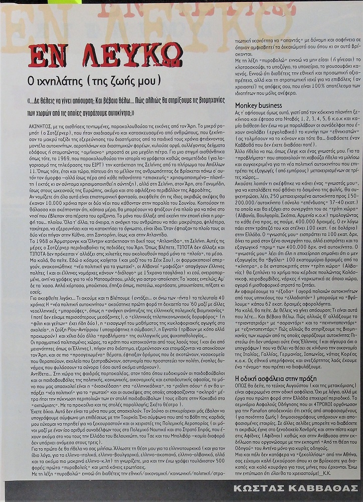 Στο ίδιο τεύχος ο Κώστας Καββαθάς έγραψε στο "Εν λευκώ" τα καυστικά του σχόλια για τις αποσύρσεις των παλαιών αυτοκινήτων και για κάποιες "monkey businesses" εμπόρων οι οποίοι τα 'κονόμαγαν, κοινώς, με τις πριμοδοτούμενες εξαγωγές σαράβαλων σε χώρες των Βαλκανίων, και όχι μόνο, με τον μοναδικό τρόπο που ο Καββαθάς ήξερε να γράφει και να τσουρουφλίζει τα ξερόχορτα.