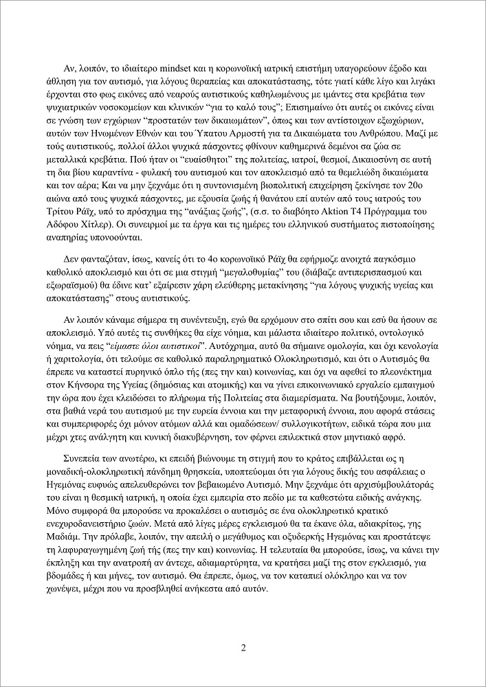 Μια απίστευτη επιστολή, κόλαφος για την πολιτική και ιατρική κοινότητα, μου έστειλε χθες η Νατάσα Ματράγκα, άτομο με αυτισμό και διάγνωση ότι πάσχει από το Σύνδρομο Άσπεργκερ.