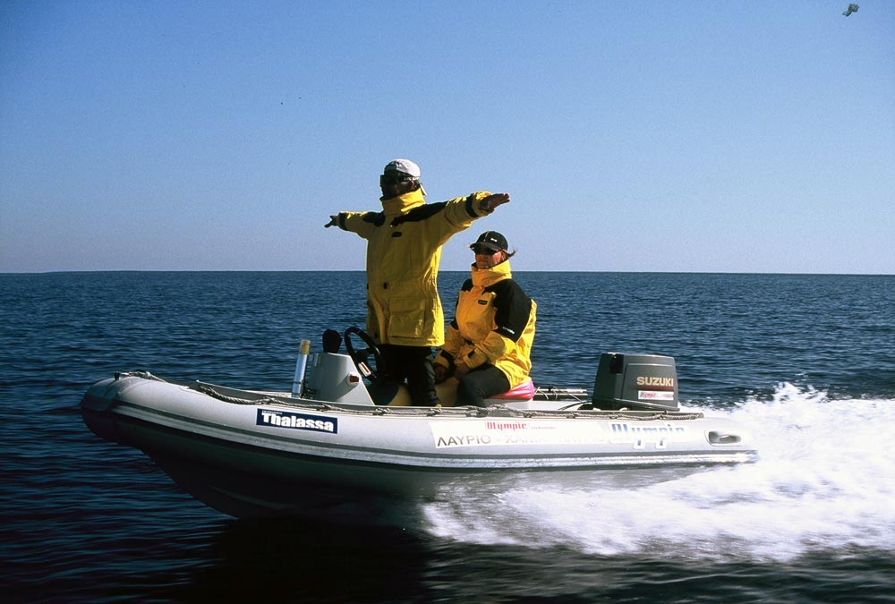 Η κατανάλωση δεν μας απασχολούσε ιδιαίτερα, αλλά για να μην ψαχνόμαστε και για να ζυγίσουμε σωστά και τα βάρη στα φουσκωτά, πήραμε ένα σαραντάρι δοχείο με μακρύ σωλήνα παροχής, που το στριμώξαμε μπροστά, μεταξύ της κονσόλας και του πλωριού αεροθαλάμου. Απαραίτητο δικό μου "εξάρτημα" ο πλαστικοποιημένος χάρτης του ταξιδιού, με προσημειωμένες επάνω του τις πορείες και τις αποστάσεις. Αν και ο καιρός ήταν ήπιος, φορέσαμε, καλού κακού, νιτσεράδες και γαλότσες, ενώ στις λιτές αποσκευές μας συμπεριλάβαμε και τα κράνη. "Κάλλιο γαϊδουρόδενε παρά γαϊδουρογύρευε", είπα του Στέφανου. Όσο πάντως και αν αυτό ακούγεται υπερβολικό, στο μοναδικό φουσκωτό που ποτέ δεν χρειάστηκε να φορέσω νιτσεράδα και κράνος ήταν το 3,80 του Στεφανίδη, με εξαίρεση βέβαια τον βροχερό καιρό, τότε που κανείς δεν μπορεί να αγνοήσει τον αδιάβροχο ρουχισμό. Δεν μπορώ πάντως, ακόμη, να εξηγήσω τους λόγους για τους οποίους συνέβαινε αυτό.