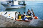 Ο γερόλυκος των φουσκωτών Μπάμπης Μπουζάκης μας έκανε την τιμή να φωτογραφηθεί μαζί μας λίγο προτού λύσουμε κάβους.Τα αυτοκόλλητα γράμματα με τα λογότυπα των εταιρειών του μοναδικού χορηγού μας τοποθετήθηκαν πάνω στην τέντα πλεύσης, μαζί με το λογότυπο του ΑΝΤ1 και το μήνυμα "Let us keep our seas clean" (ας διατηρήσουμε τις θάλασσές μας καθαρές). Συμπληρωματικώς μπήκαν και τα λογότυπα του αντιπροσώπου της "Silva Marine" (πυξίδες), της "Kodak", που μας έδωσε αρκετές αδιάβροχες φωτογραφικές μηχανές μιας χρήσης, και βεβαίως του καλού μου φίλου Μάκη Παυλάτου, που είχε ράψει αφιλοκερδώς εκείνη την εκπληκτική τέντα-δωμάτιο.