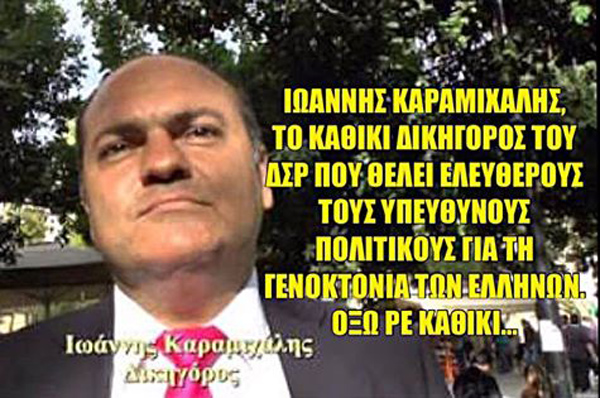 "Εγώ θα ήθελα να βγεις και να πεις στις 6.000 Ελληνικές οικογένειες που έχασαν αυτόχειρες, ότι πρέπει να τους είναι αρκετό ότι "δε θα χαιρετάει ο λαός τους υπεύθυνους για τις αυτοκτονίες αυτές" καραμαλάκα Καραμιχάλη. Και ότι αυτό είναι "αρκετή τιμωρία". Θα ήθελα επίσης να χάσεις κι εσύ ένα παιδάκι και μια καριέρα χωρίς να φταίς, για να καταλάβεις πόσο μαλάκας και πόσο γλύφτης της εξουσίας των Εθνοπροδοτών είσαι Καραμιχάλη. Ακούστε τον όλοι από το 16' λεπτό".